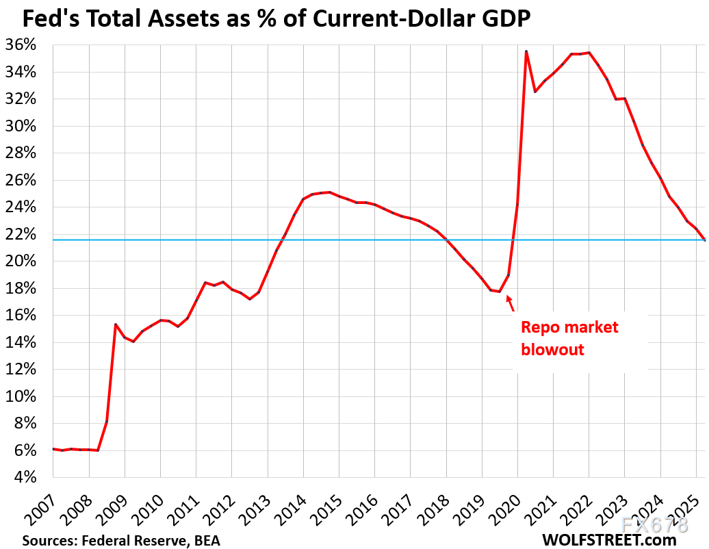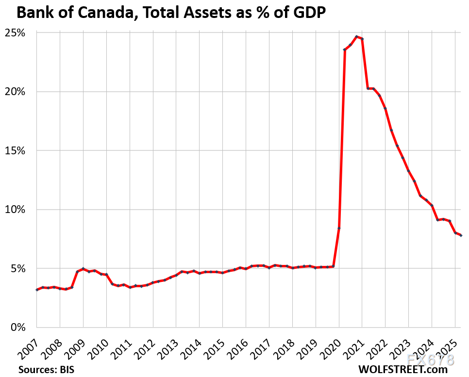 加拿大央行在实施短期但规模空前的QE后,于2020年第四季度触及24.7%的资产/GDP峰值。